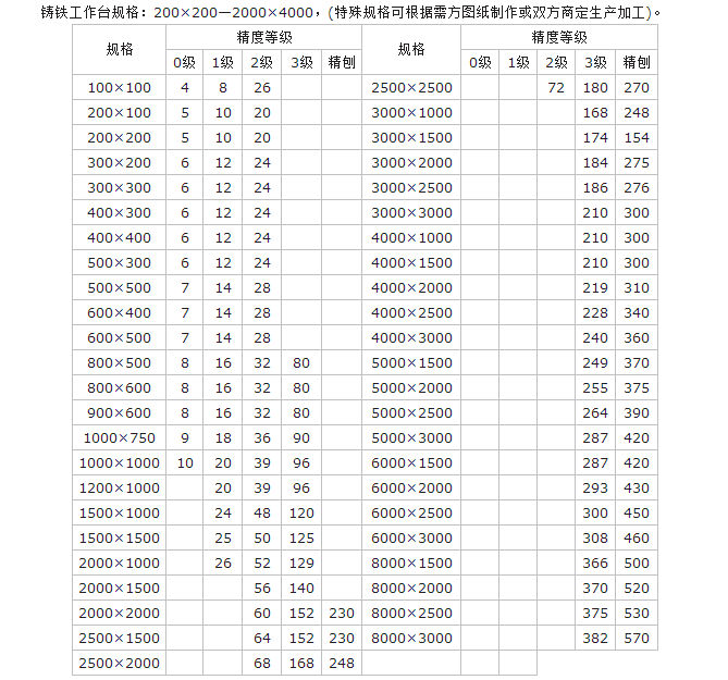 AA級鑄鐵工作臺:其平面度(μm)=1+1.6D2(D為平臺對角線長或直徑),用于高度精密之測定之用,常用于實驗室;